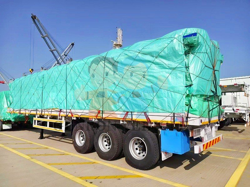 A batch of flatbed semi trailers arrived at the loading port, preparing to be shipped to Chad.