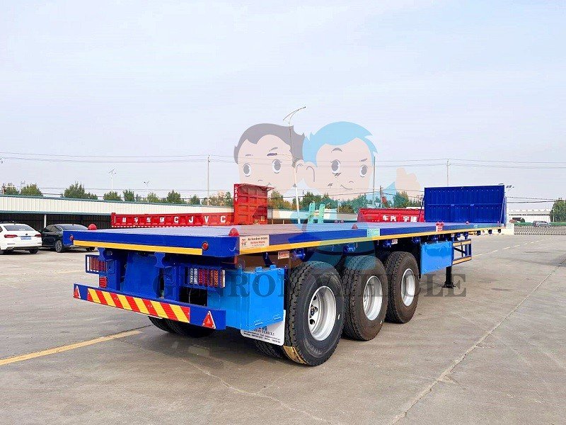 Our this flatbed trailer is 13m long, tare weight is about 7 tons. With 12 sets twist locks for container and bulk cargo load. Loading capacity is about 50 tons. We designed a 700L oil tank and install on the front of trailer according to customer’s special requirements. And under the trailer’s tail we installed another two small tool boxes.